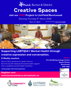 Burton & District Mind are delivering arts sessions to support people (aged 16+) who identify as LGBTQIA+ and have mental health problems. The sessions will help to build confidence, improve wellness and help to build local connections. We start our programme in March 2026 in Tamworth and in Burntwood, with a group arranged in Burton for later in the year.