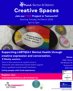Burton & District Mind are delivering arts sessions to support people (aged 16+) who identify as LGBTQIA+ and have mental health problems. The sessions will help to build confidence, improve wellness and help to build local connections. We start our programme in March 2026 in Tamworth and in Burntwood, with a group arranged in Burton for later in the year.